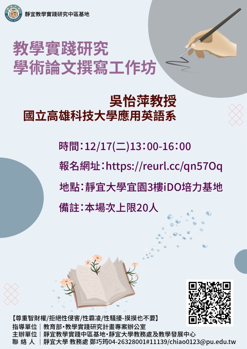 【中區基地-靜宜大學】113/12/17辦理「教學實踐研究學術論文撰寫工作坊」研習活動