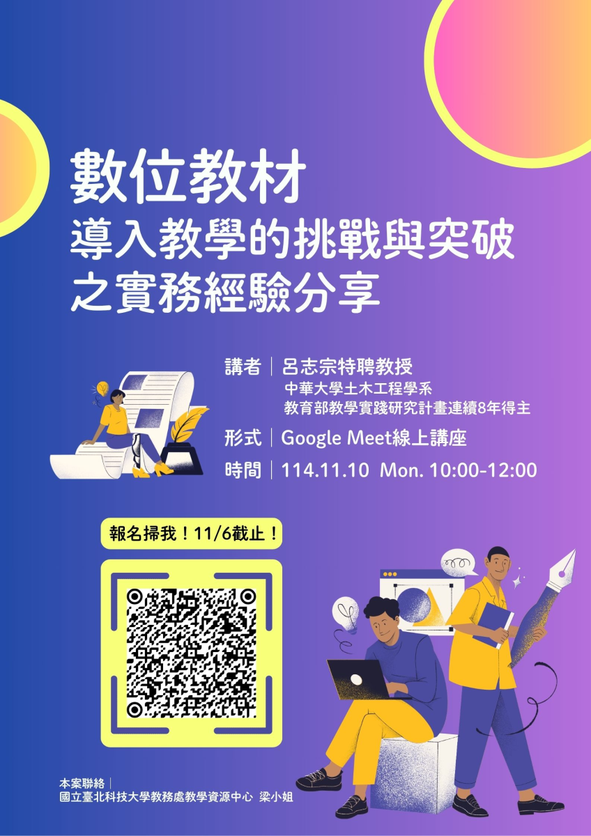 【北區基地-國立臺北科技大學】114年10月22日(三)計畫撰寫進階實作工作坊、114年11月10日(一)創新教學線上工作坊
