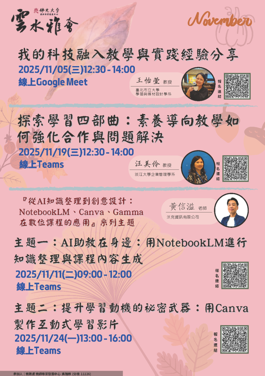 1、活動名稱:『從 AI 知識整理到創意設計:NotebookLM、Canva、Gamma 在數位課程的應用』系列主題:主題一:AI 助教在身邊:用NotebookLM進行知識整理與課程內容生成。