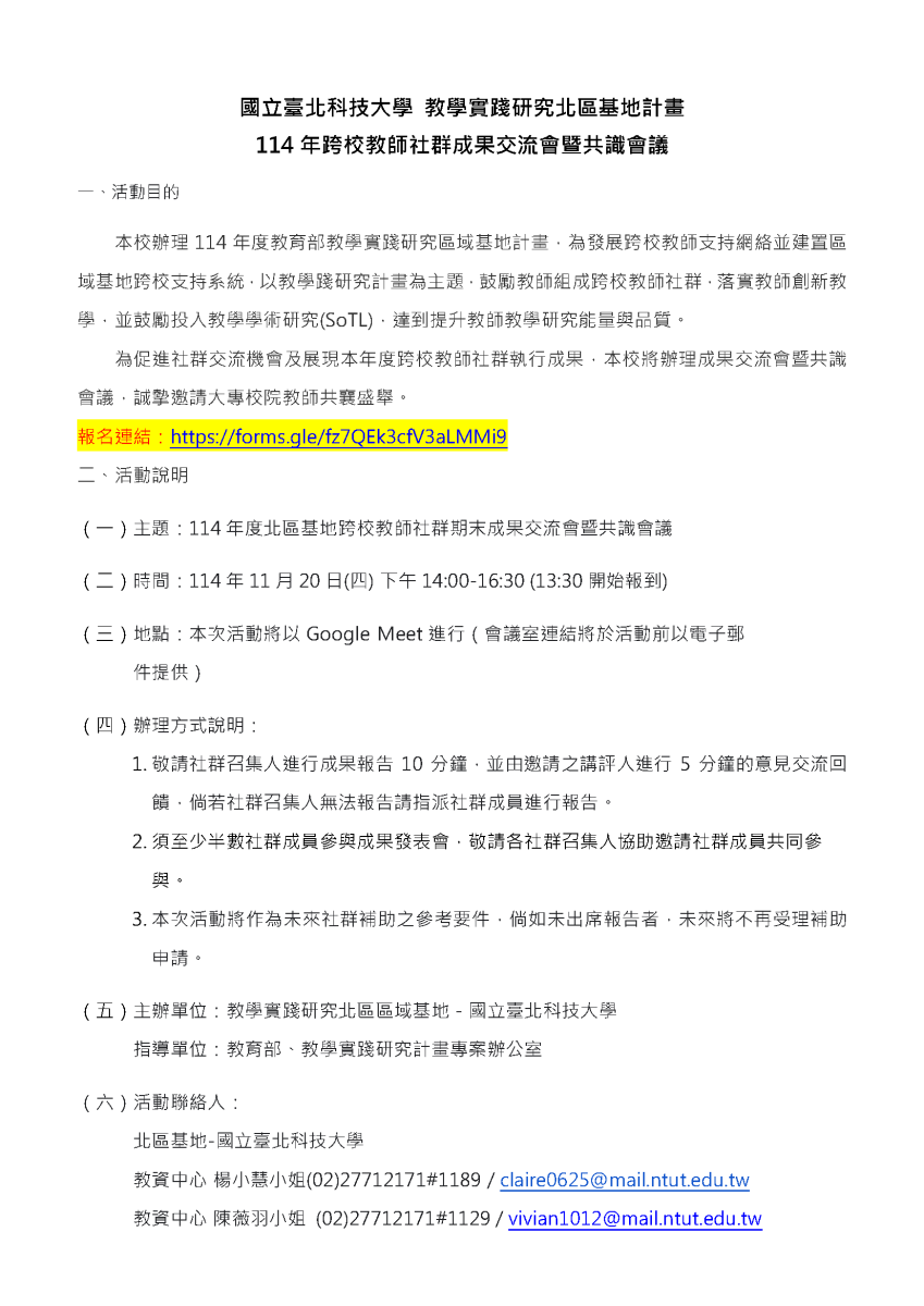 【北區基地-國立臺北科技大學】114/11/20【14年度跨校教師社群成果交流會暨共識會議】活動資訊