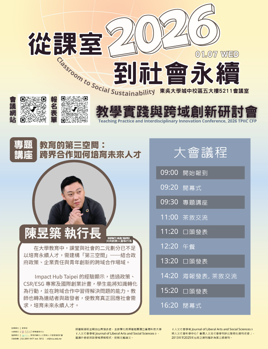【東吳大學】115/1/7 「2026從課室到社會永續:教學實踐與跨域創新研討會」活動資訊