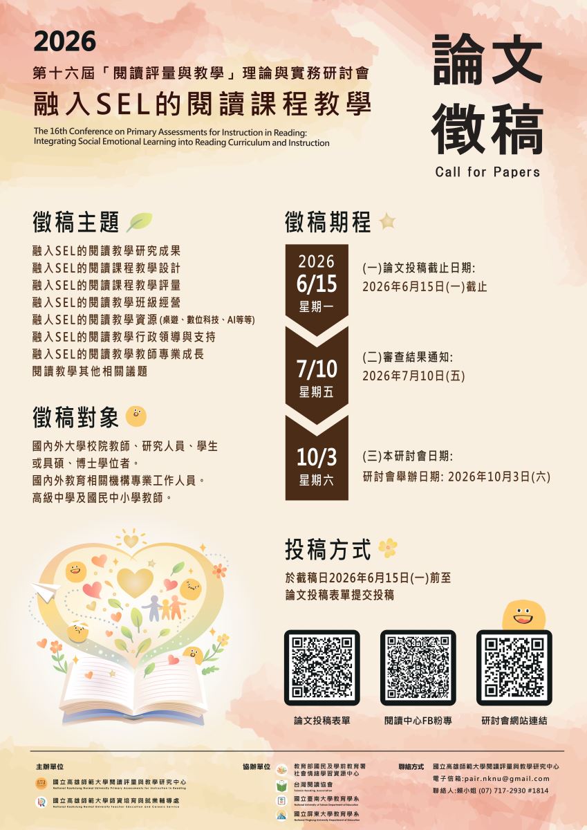 【論文徵稿】2026年融入SEL的閱讀課程教學暨第16屆「閱讀評量與教學」理論與實務研討會