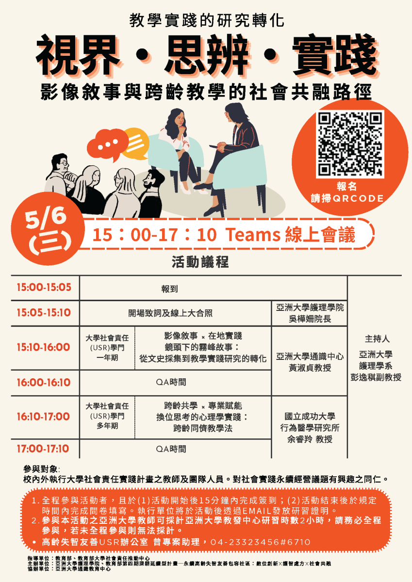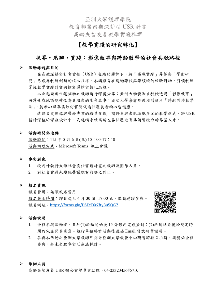 【亞洲大學】115/05/06教學實踐的研究轉化─視界・思辨・實踐:影像敘事與跨齡教學的社會共融路徑 活動資訊
