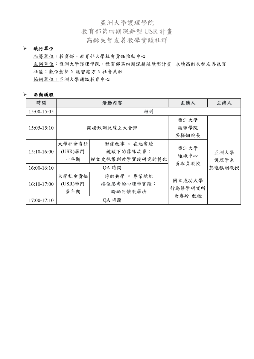 一、亞洲大學特色類深耕型計畫「永續高齡失智友善包容社區:數位創新X護智處方X社會共融」,舉辦「教學實踐的研究轉化─視界・思辨・實踐:影像敘事與跨齡教學的社會共融路徑」。本講座旨在透過跨校與跨領域的經驗對話,引領教師掌握教學實踐計畫的撰寫邏輯與轉化思維。透過文史影像與醫療專業的跨界交織,期許參與者能汲取多元的教學模式,將USR精神深植於課程設計中,為建構永續高齡友善社區培育具備實踐力的專業人才。