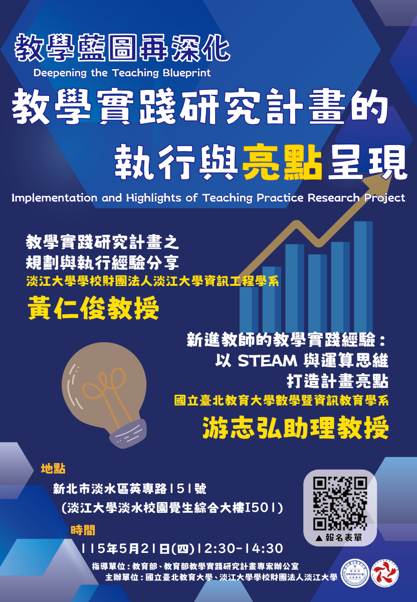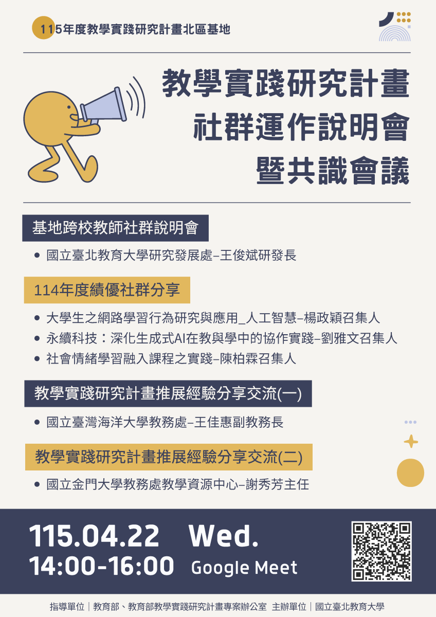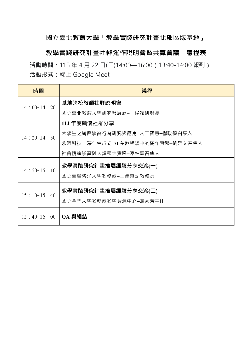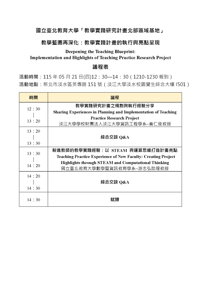 【北區基地-國立臺北教育大學 】115/4/22「教學實踐研究計畫社群運作說明會暨共識會議」線上活動以及5月21日(四)辦理「教學藍圖再深化:教學實踐計畫的執行與亮點呈現」實體活動